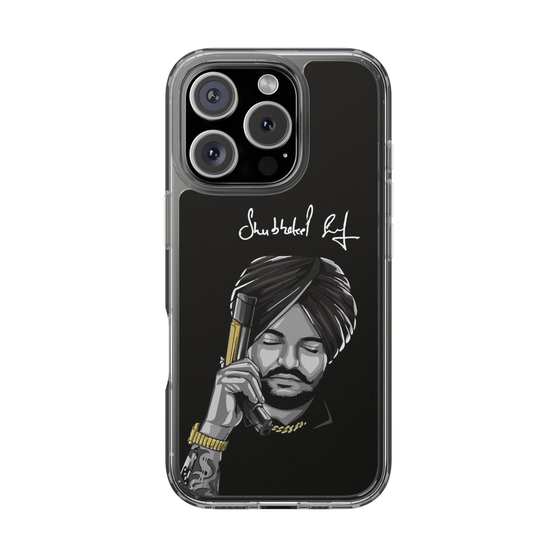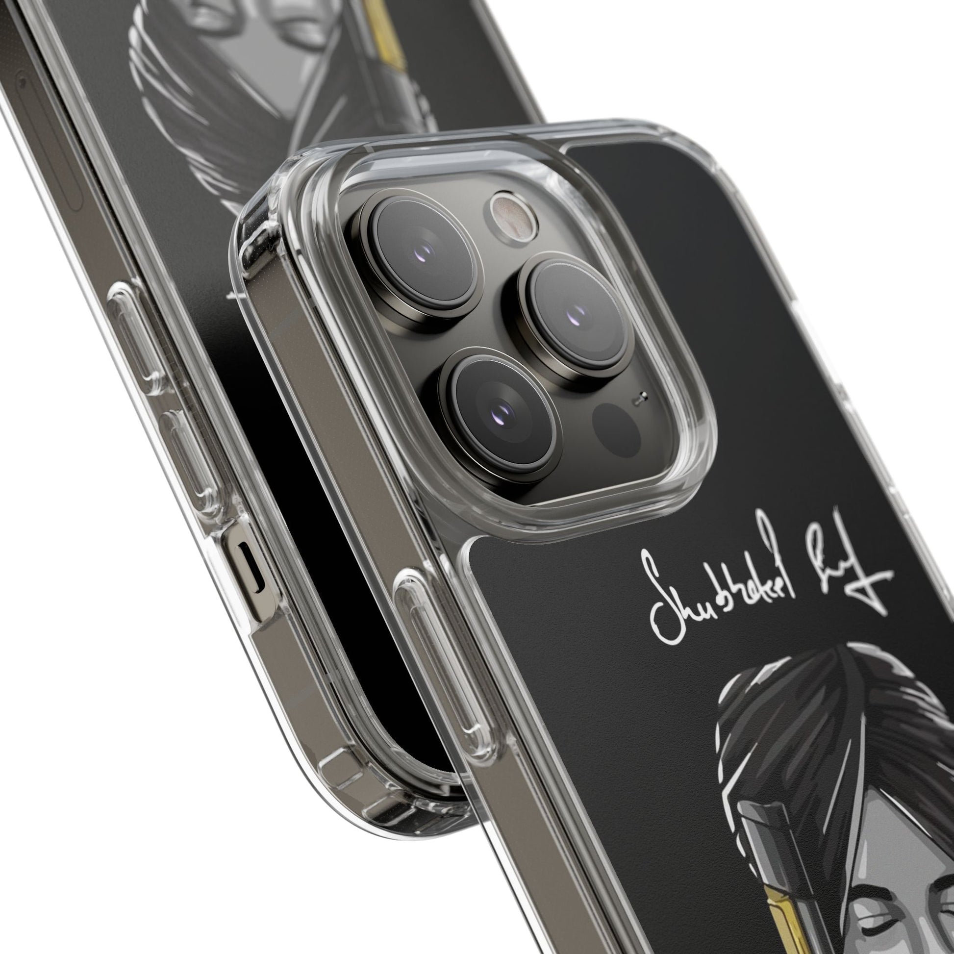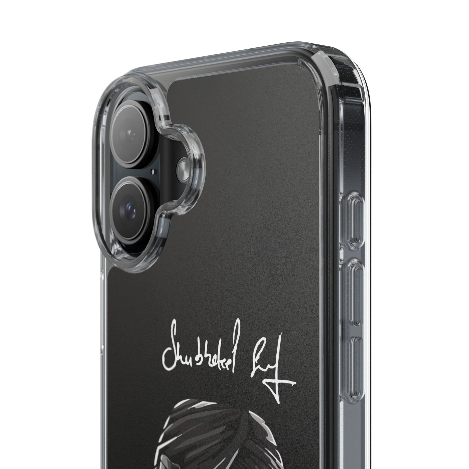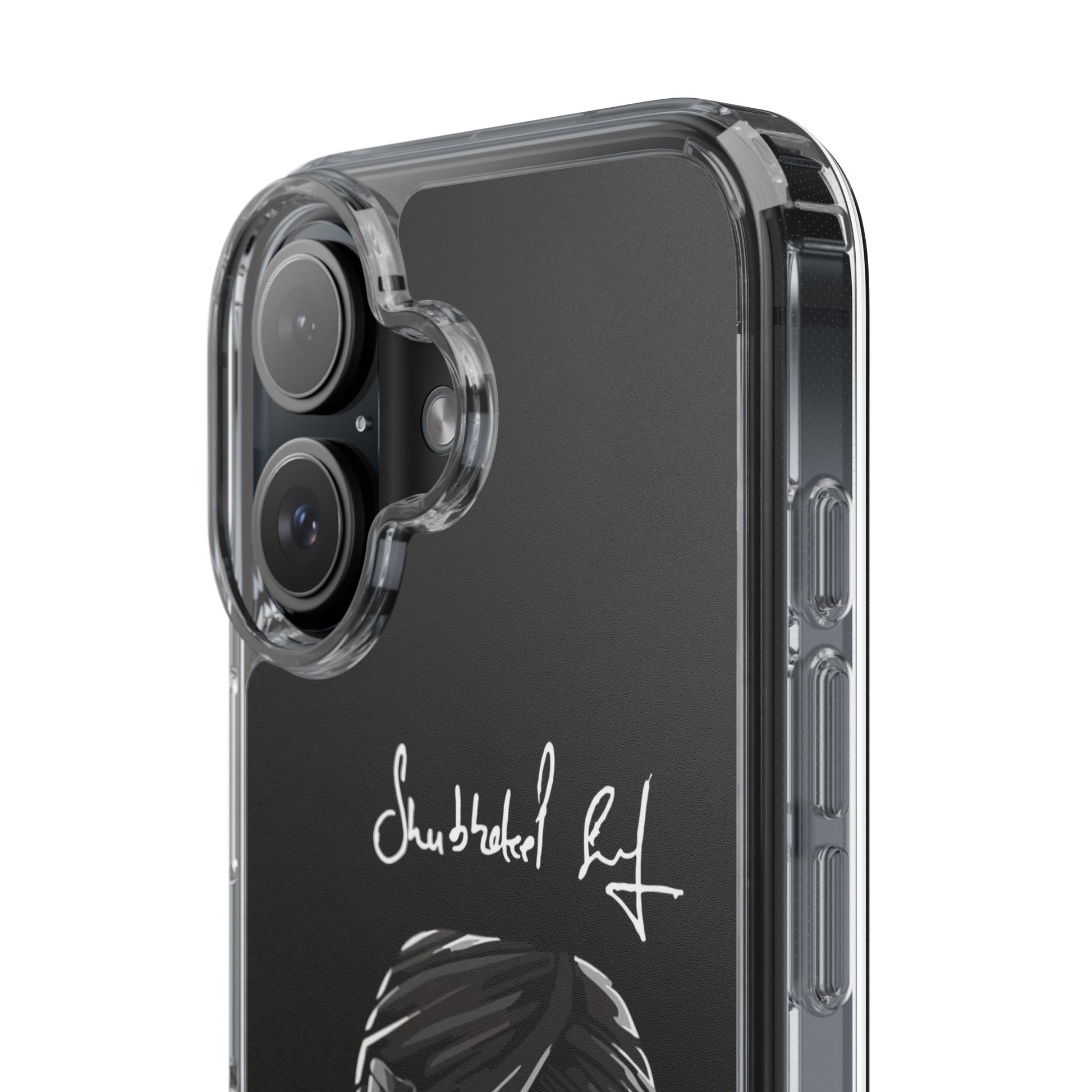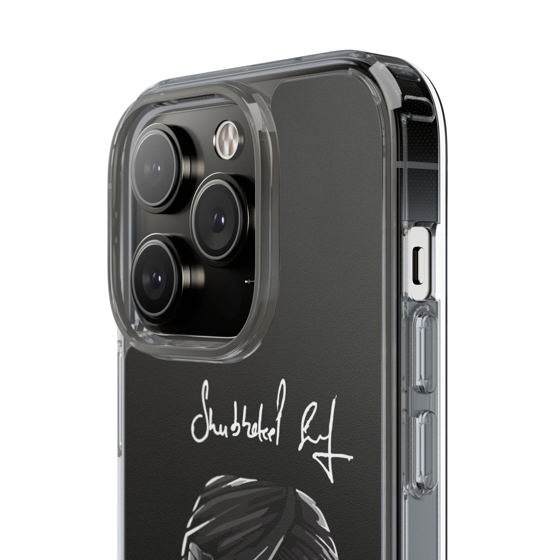 A slim, clear phone case with attitude. The design centers on a moody illustrated portrait in grayscale, accented with gold details — a bold pendant, watch, and the phone’s golden edge — set against a deep black background. It feels like a private moment: a contemplative voice call, a quiet beat, and a signature scrawled above. The slim polycarbonate back and TPU sides keep the case light and pocket-friendly while still absorbing shocks and resisting scratches. Precise cutouts keep ports and cameras accessible and wireless charging ready, so protection never gets in the way. This case suits someone who lives between style and edge — someone who carries music, memories, and a strong sense of self wherever they go.